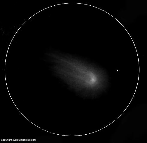 stime: M1 +4,5 (77x Meade, la cometa non era visibile nel 7x50) M2 +10,5 (206x Meade; incertezza notevole) chioma 3' (77x Meade; visibile solo la parte centrale) grad. 6-7 (77x Meade) Forma tondeggiante, ma si riesce a scorgere un getto in P.A. 65° (ENE), presumibilmente quello che origina la coda di ioni, visibile su appena 5' ai 77x del Meade. Ai 312x la chioma interna appare più brillante in direzione solare. Autore: Simone Bolzoni Per vedere l'immagine più grande clicca sull'immagine. |
